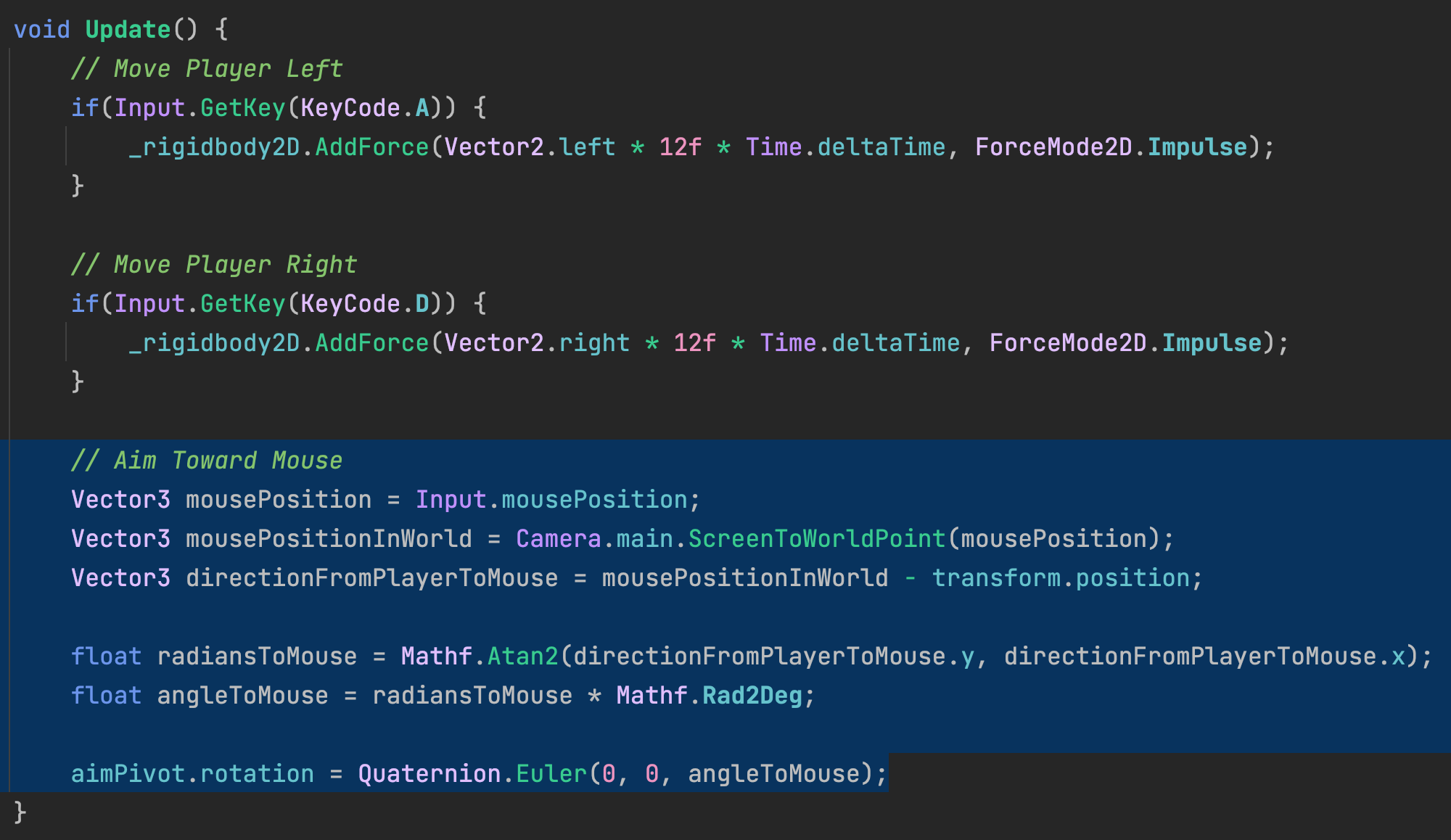 We will add Mouse Aiming code to the Update event of our PlayerController script on our Character gameObject.