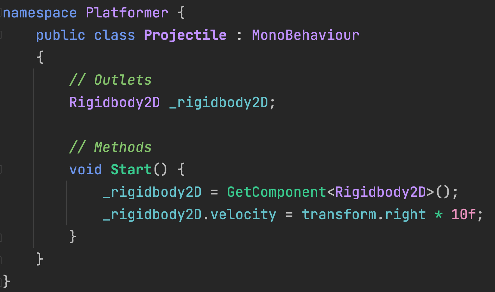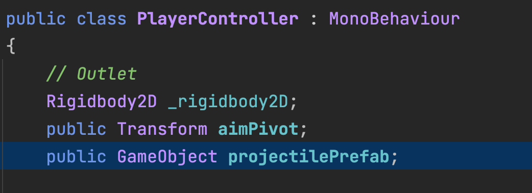 We will control our Projectile movement with physics, so we must create an Outlet for Rigidbody2D to reference it in code.