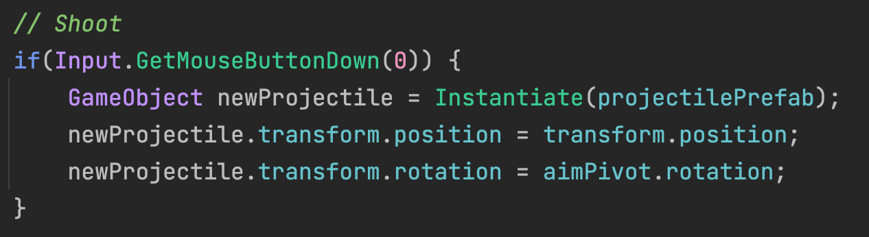 When the MouseButtonDown (not MouseButton “held”) event of the left-click occurs, we create a new instance of our projectile prefab, position it where our character is, and rotate it to match our aimPivot. Right now the projectile just floats in mid-air.