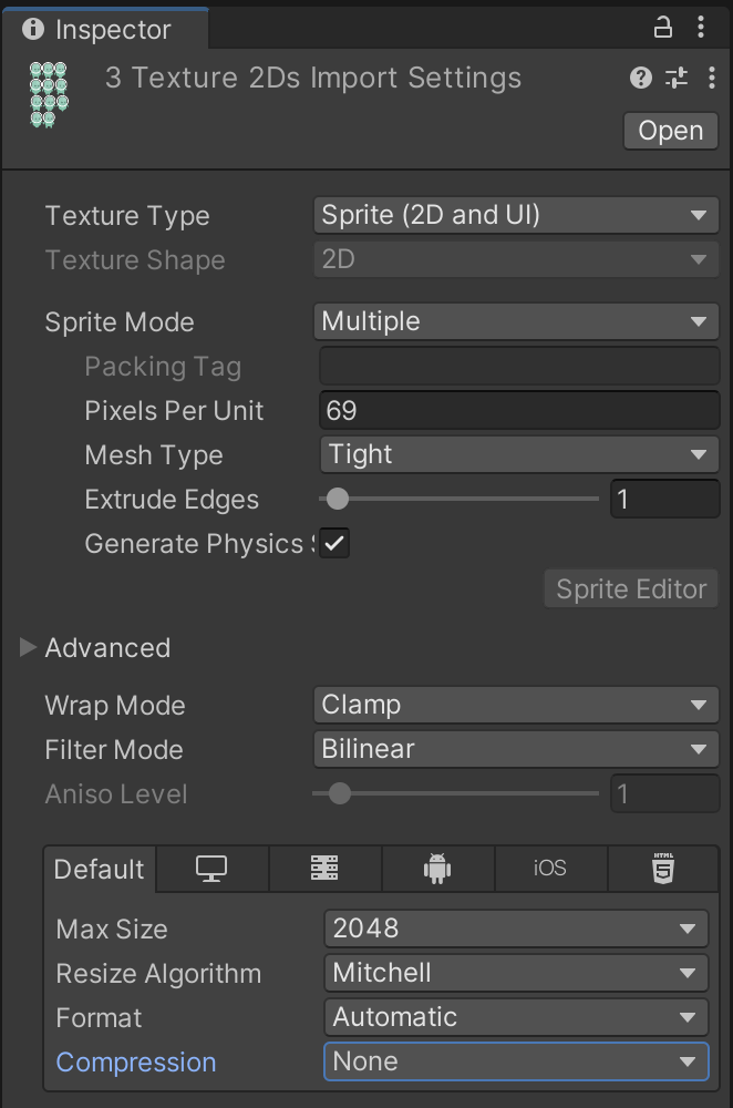 Set the items_spritesheet, tiles_spritesheet, and p1_walk Sprite Mode to Multiple, Pixels Per Unit to 69, and click Sprite Editor. Click Apply if prompted.