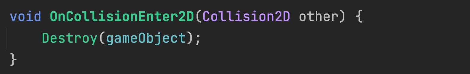We setup an OnCollisionEnter2D event where we tell our projectile to remove itself from the game.