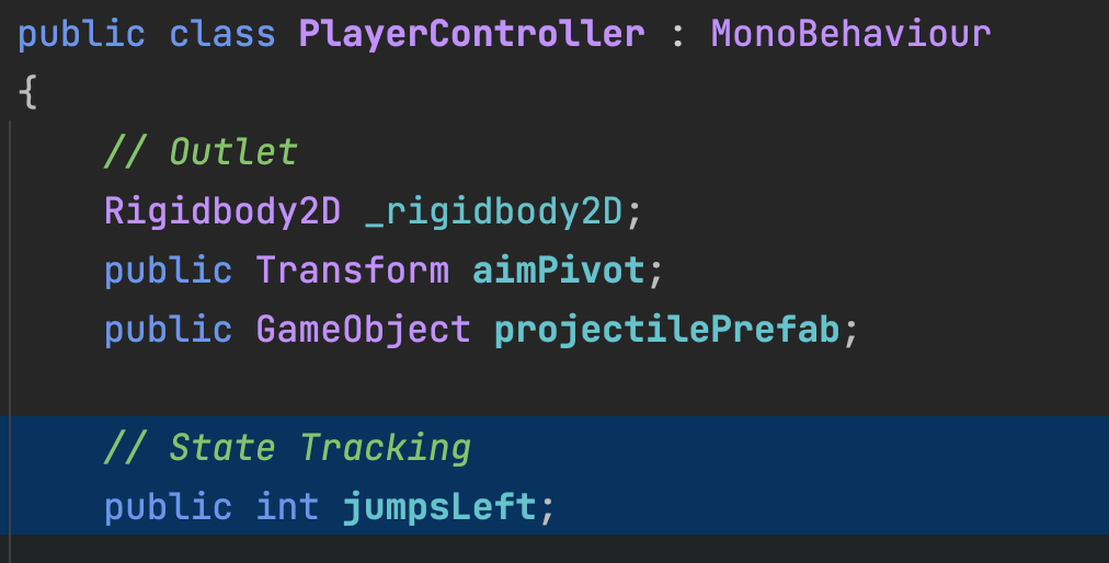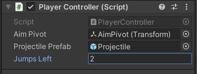 In our PlayerController, we can make jump count configurable by creating a Public Property to keep track of how many jumps we have left.