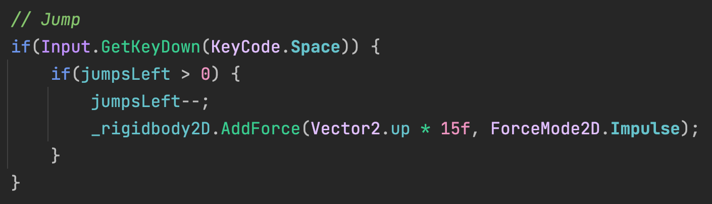 When our character jumps, we reduce the number of jumps left and add an upward physics force. You may want a different force strength depending on your Game Feel.