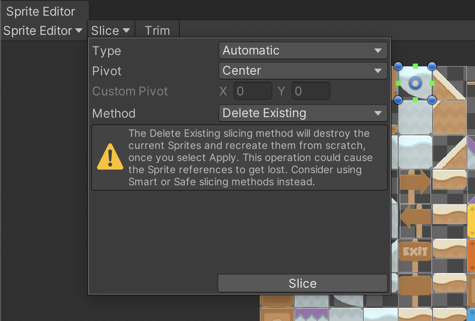 In Sprite Editor, click the Slice dropdown, set Type to Automatic, click the Slice button, then click Apply.