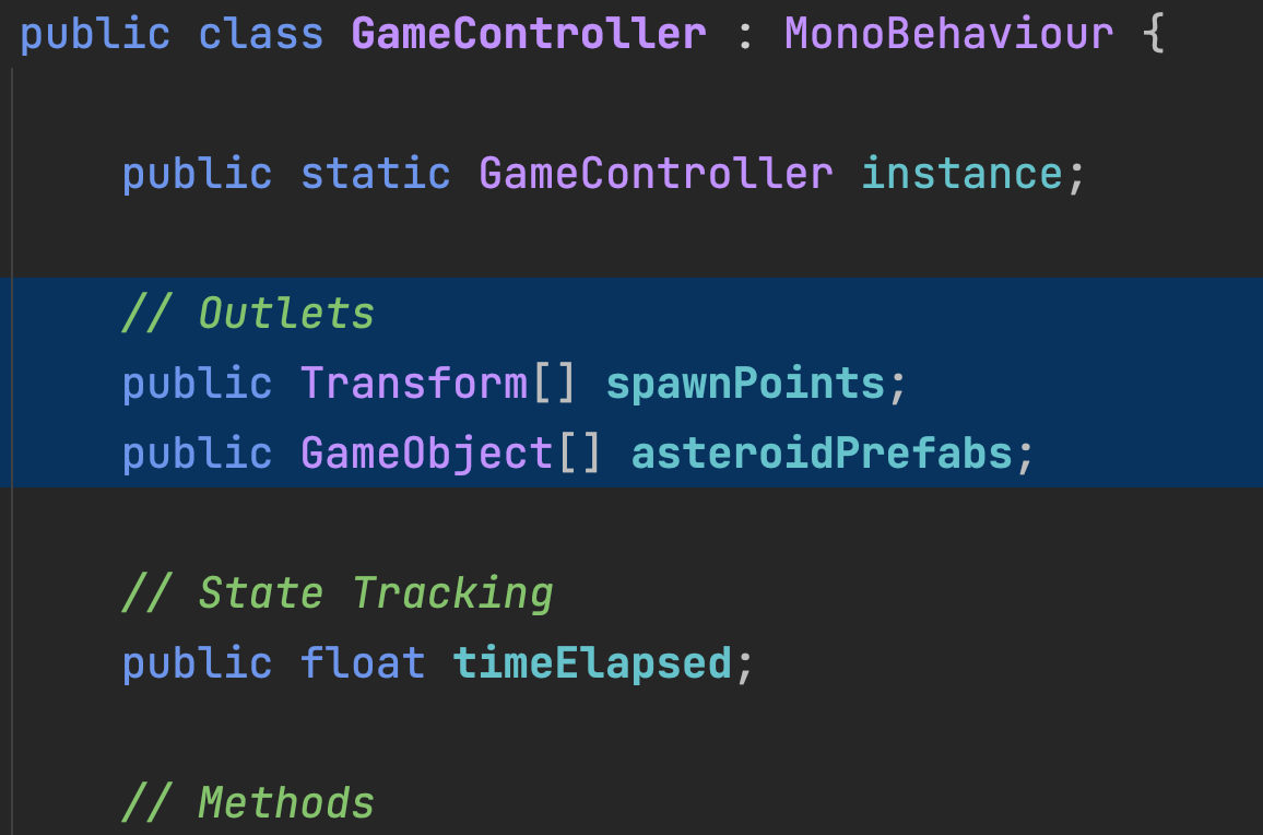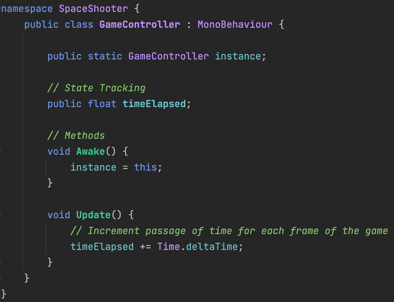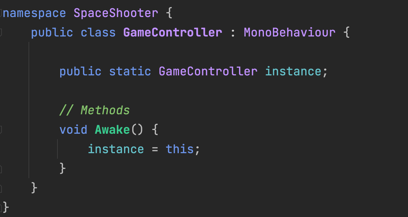 This allows us to reference GameController purely through code without having to drag-and-drop into a property field on every other object. Static Instance Referencing ONLY works if there is exactly one of an object. There will always be only one GameController in this scene.