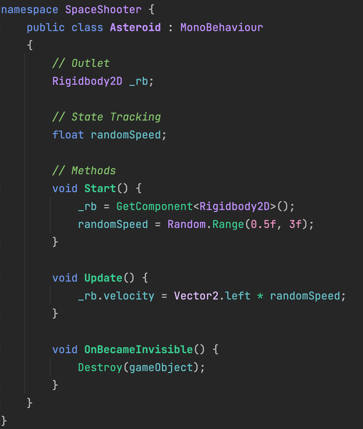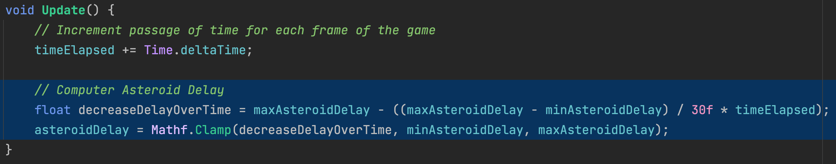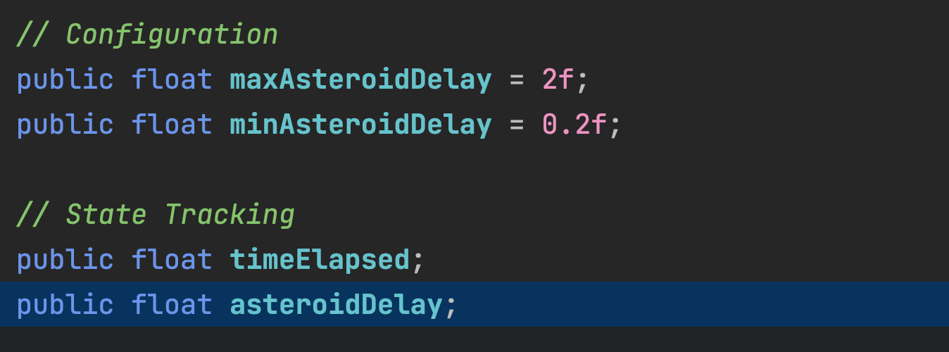 To put this on a timer, we need a property to keep track of the delay between asteroid spawnings. We will also have a configurable minimum and maximum delay.
