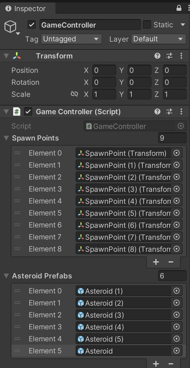 Fill in these blanks in the inspector. spawnPoints are in your Scene. asteroidPrefabs must be Prefabs from your Library.
