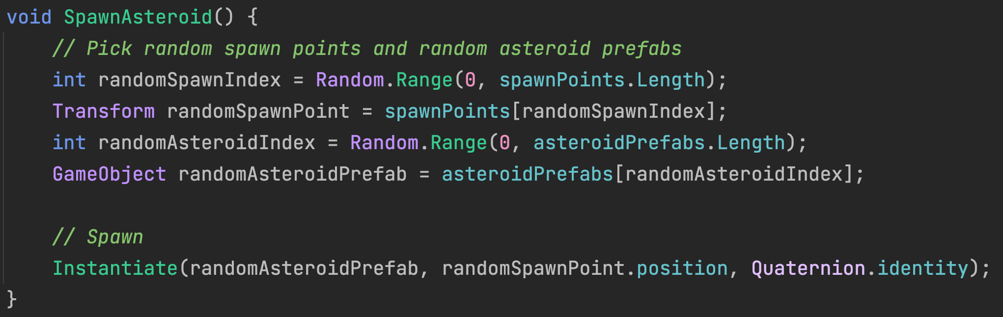 Create a function for spawning a random Asteroid Prefab at a Random Spawn Point.