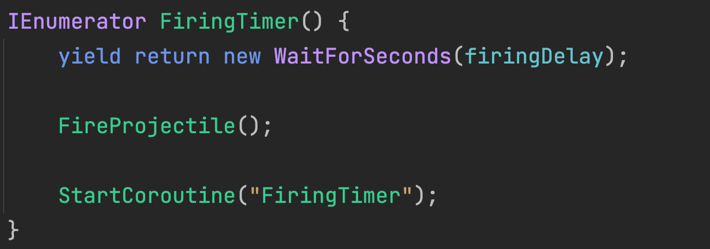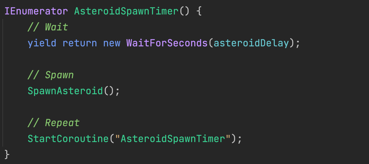 We will create a Coroutine using an IEnumerator to act as a delay timer between asteroid spawns. Coroutines ARE NOT true multithreading or background threads, but are a technique for setting up "Side Events" in addition to Unity's main loop.