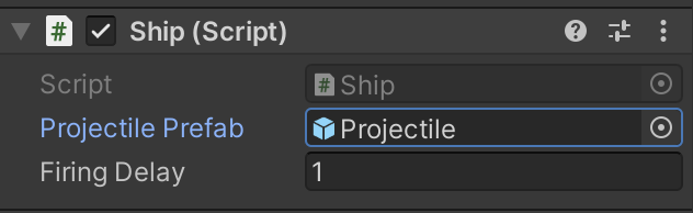 We start by creating a Public Outlet for the projectile prefab we want to shoot, and creating a firingDelay property so we can dynamically change the frequency of our shooting.