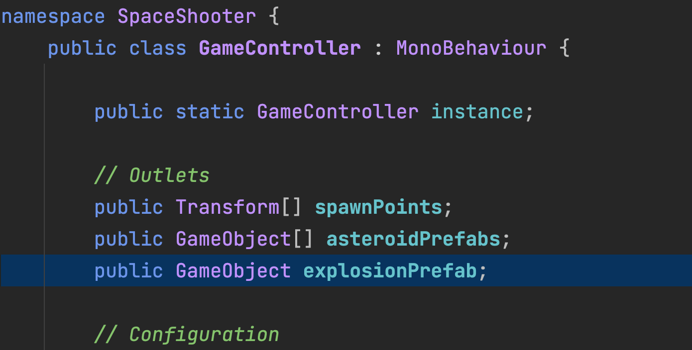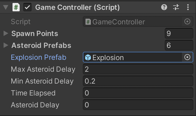 We want to use Explosions throughout our game, so we will keep a reference to our Explosion prefab in the GameController where it can be easily references by everything else in the game.