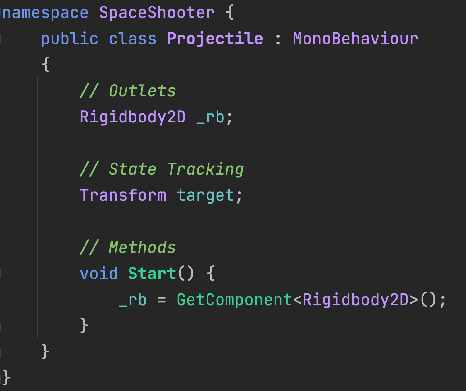 We will start off with a standard Rigidbody2D Reference Outlet. We will also create a target property for keeping track of our projectile’s target.