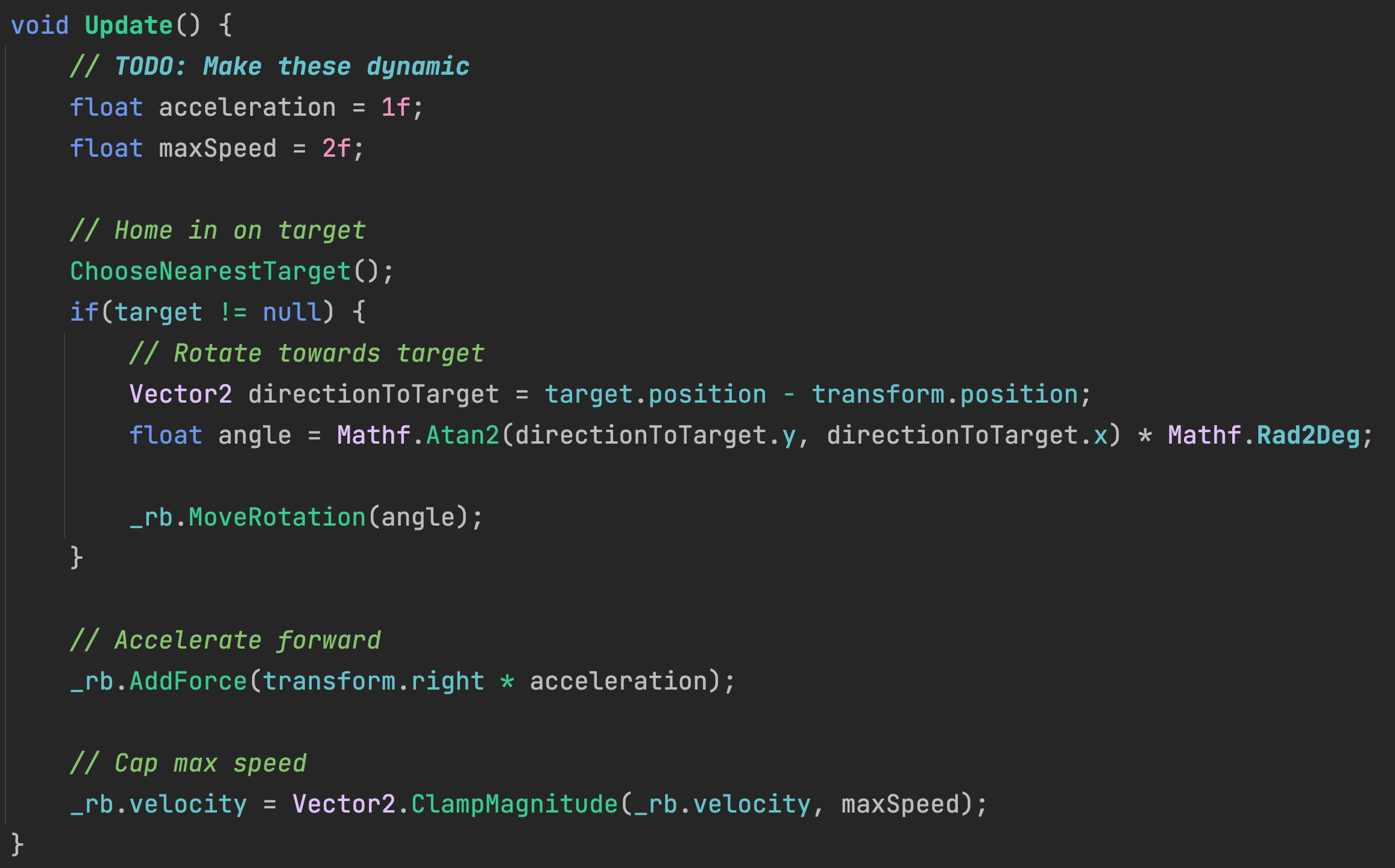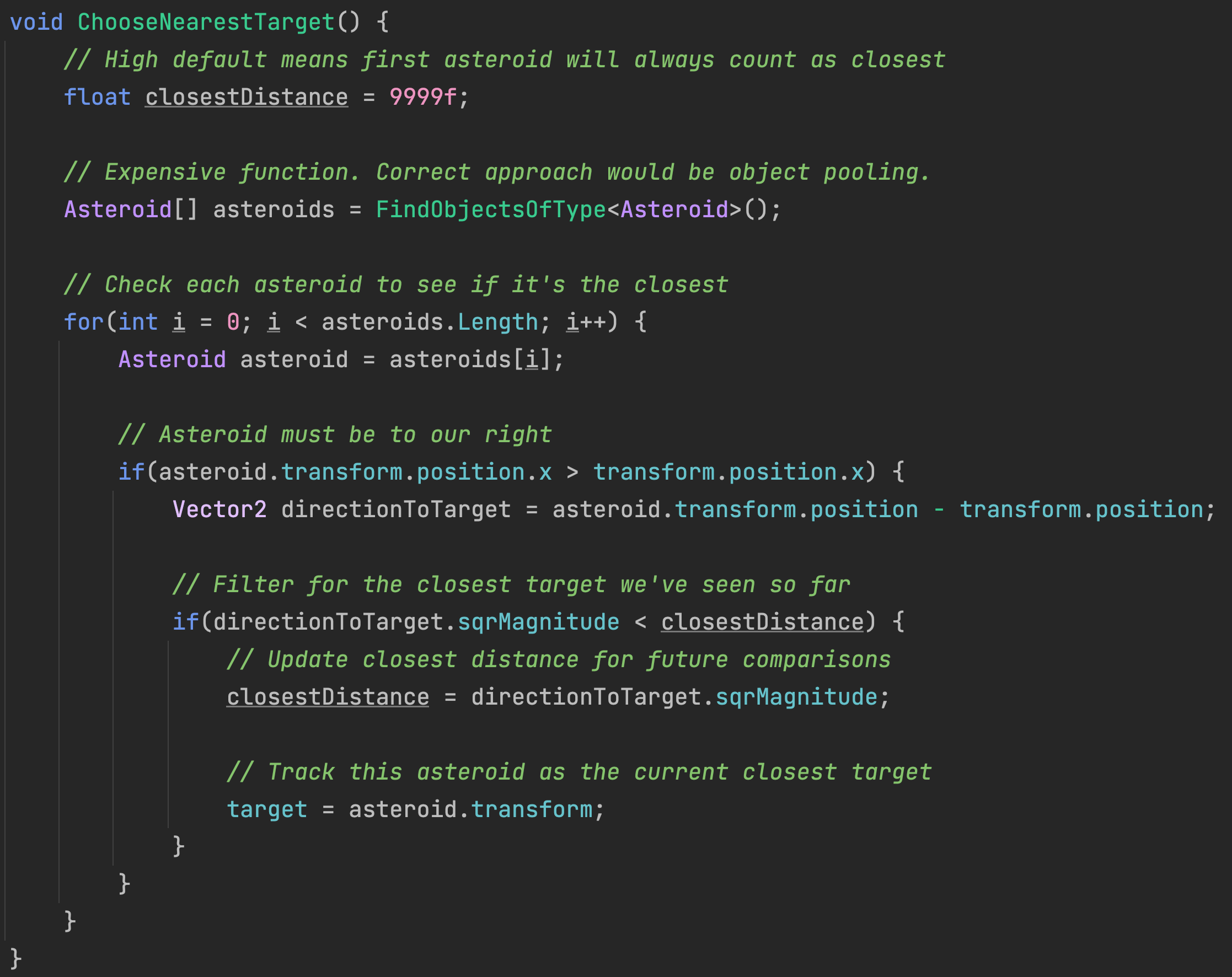 A ChooseNearestTarget function will look at every asteroid in the scene and choose a target that meets the following criteria: