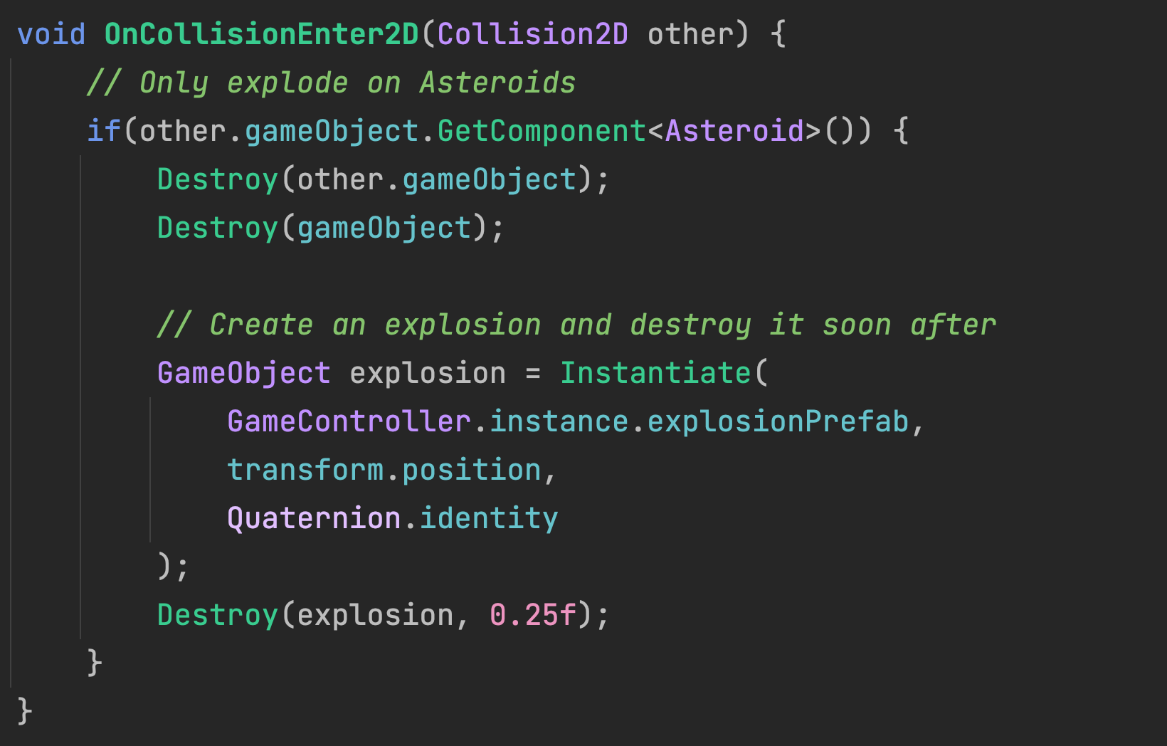 Last, on collision, we check if we have impacted an asteroid. Our projectile will destroy the asteroid, destroy itself, and create an explosion where the asteroid was. That explosion game object will destroy itself soon after.