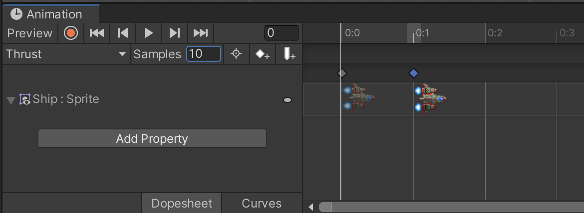 Drag the two different Ship Thrust textures from your Project onto frames 0 and 1 of the Animation timeline.