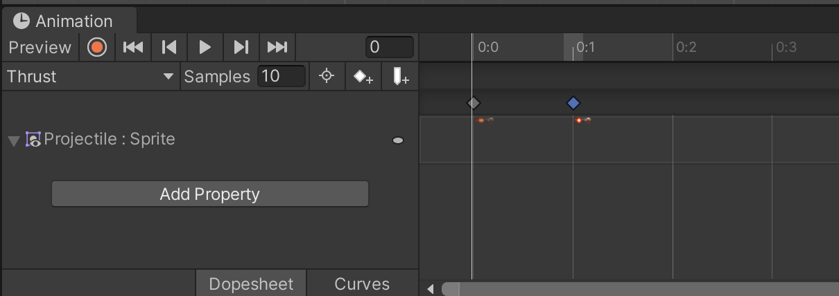 Create a Projectile Thrust animation and save it as Assets/Animations/Projectile/Thrust.anim. Use the two different Missile Thrust graphics with the configuration shown below: