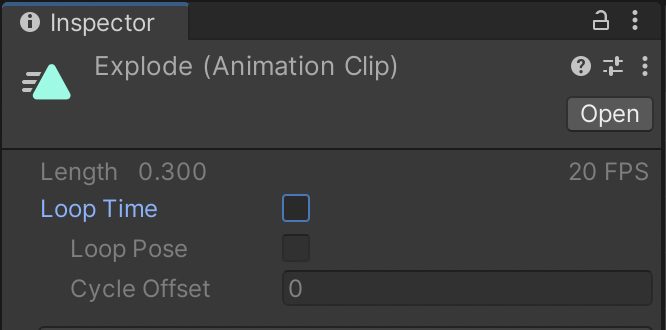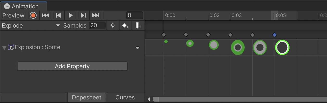 Create an Explosion animation and save it as Assets/Animations/Explosion/Explode.anim. Use spaaaaace graphics 3, 4, 6, 13, 2, and 5 in the configuration shown below: