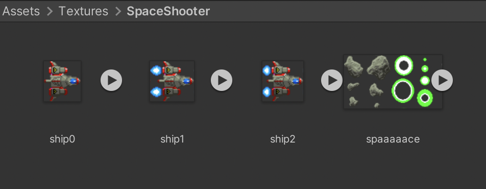 For spaaaaace, set Sprite Mode = Multiple and use the Sprite Editor to Slice with Type = Automatic. Within the Sprite Editor, set the Pivot point for the Missile sprites to "Right Center".