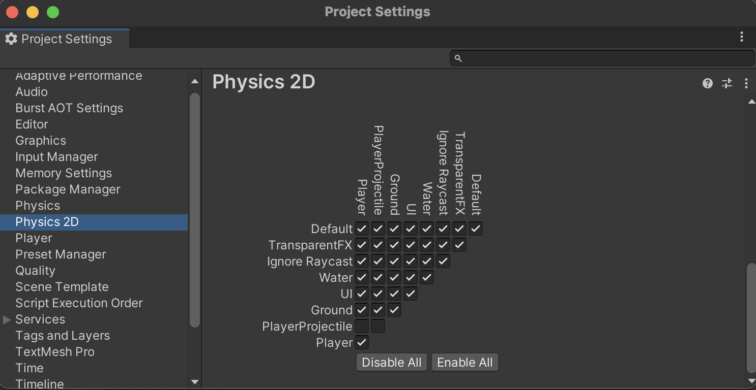 From Edit > Project Settings > Physics2D, make sure the Player and PlayerProjectile intersection is unchecked, so that Players cannot collider with their own PlayerProjectiles. We also do not want PlayerProjectiles to hit themselves.