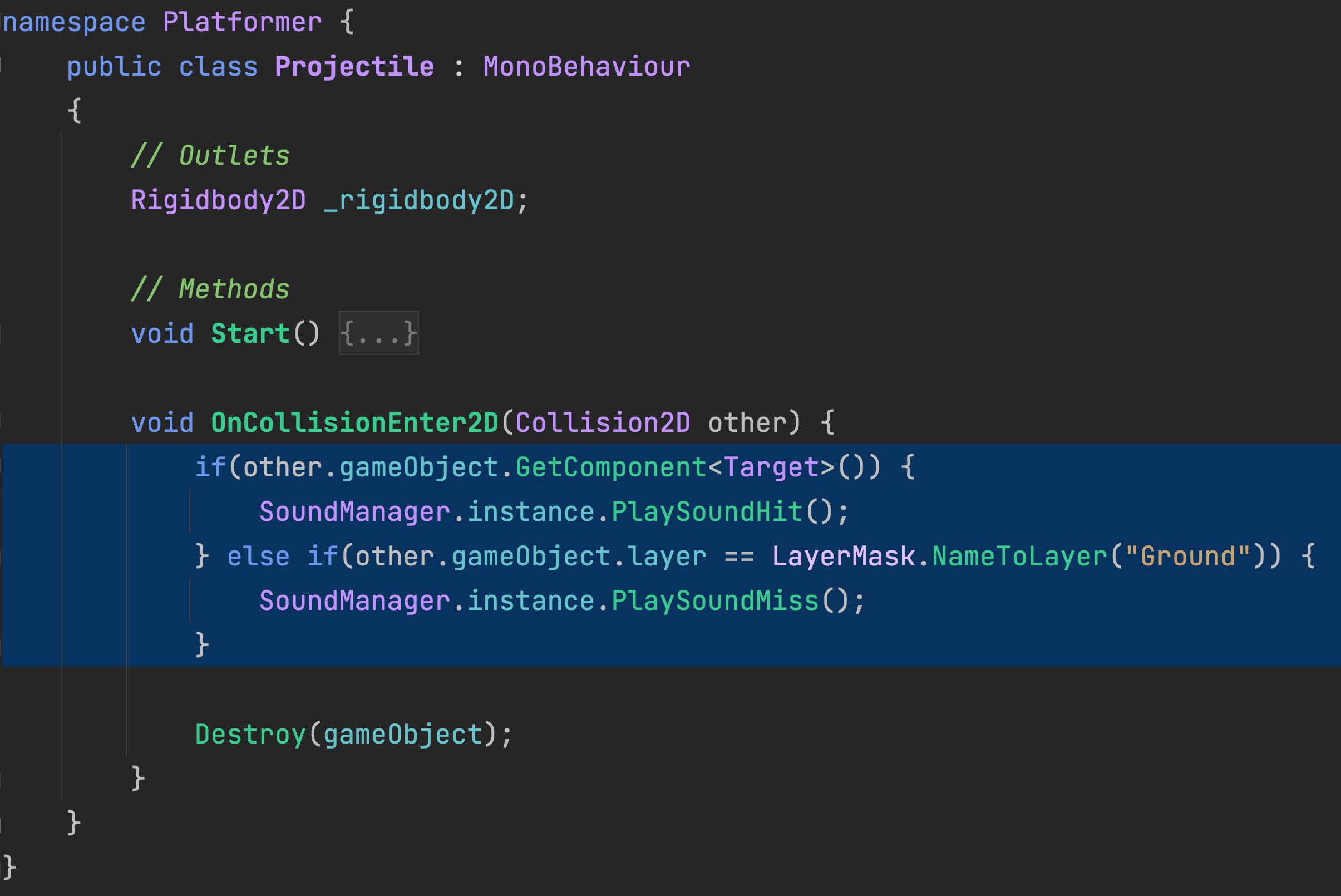 In our Projectile script, we will set up the conditions for our different sounds and call the SoundManager appropriately.