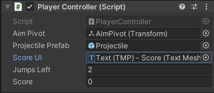 Don’t forget to assign the text UI outlet in the PlayerController.