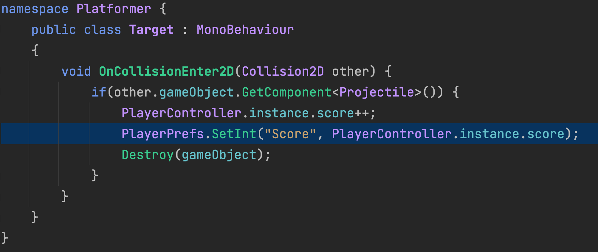 To persistently save our score, we also need to store and update an entry in PlayerPrefs whenever score changes during our Target script.