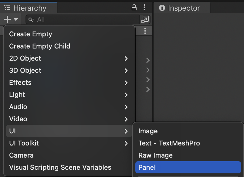 Submenus are usually just nested UI objects that are turned on and off as needed. We will set up a Pause Menu with submenus for Options and Level Select. All of these menus will be contained in a UI Panel which gives us a rectangle background.
