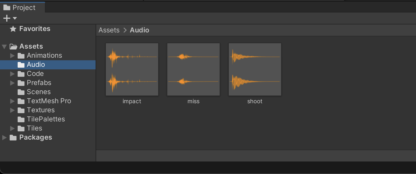 Download the "shoot", "miss", and "impact" sound files from the course files and import them into the Assets/Audio folder.