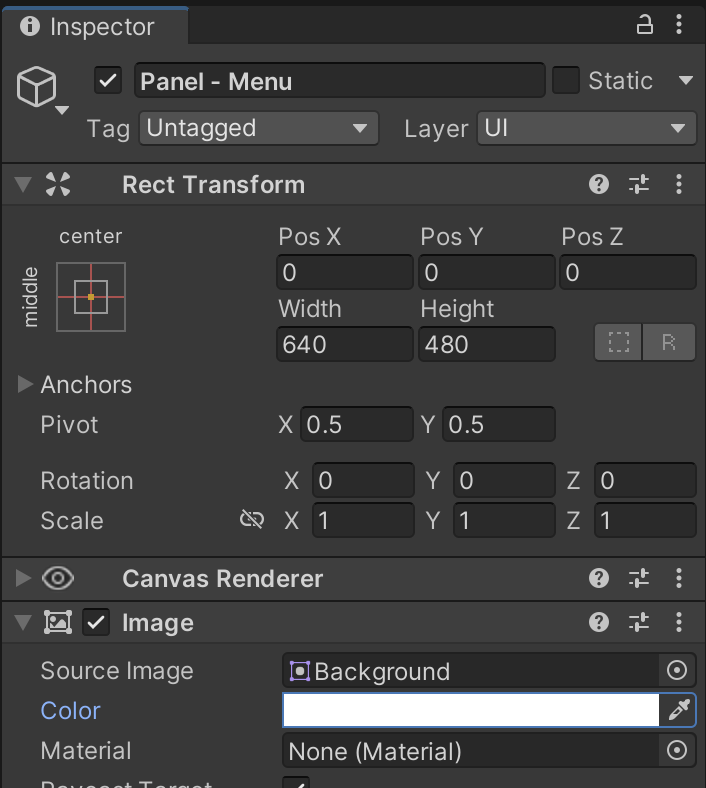 By default, panels will stretch to fill the screen. Instead, we will specify a smaller portion of the screen for the menus. Change the color tint of the background image to remove the transparency, so that the menu is less noisy.