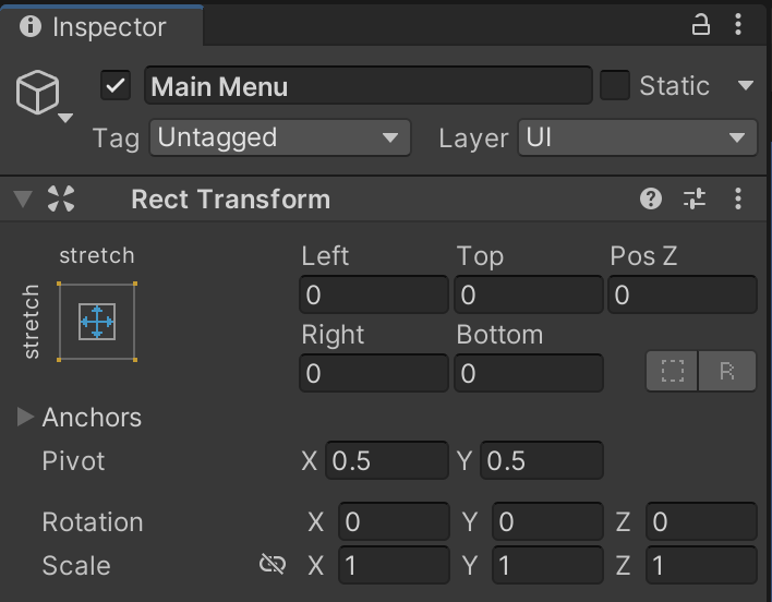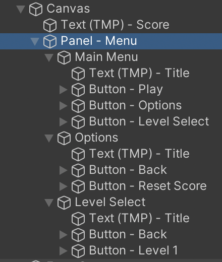 The "Main Menu", "Options", and "Level Select" game objects are just empty objects stretched to fill the parent: