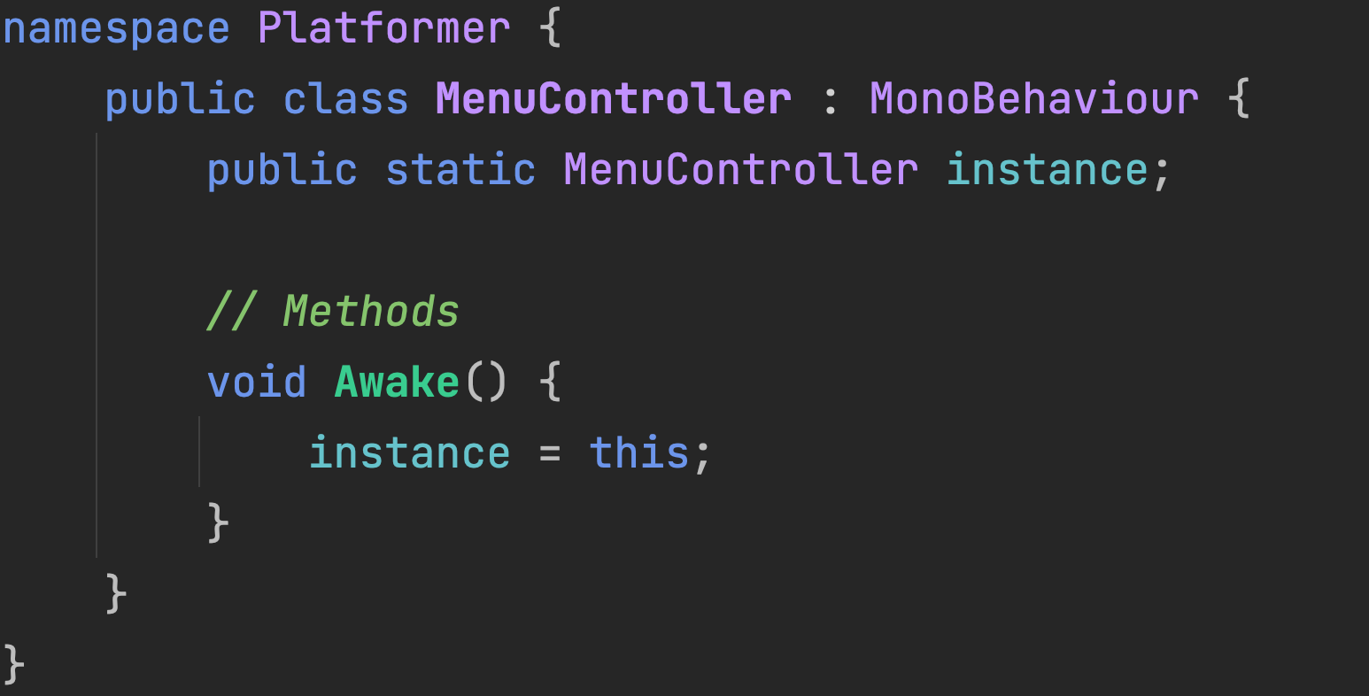 There will only be one MenuController, so we can use a static instance reference to make the menu easily accessible from other objects.