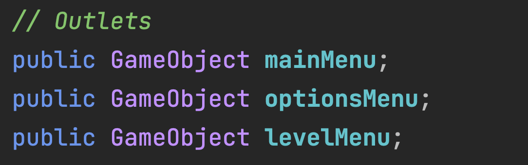 In order for our MenuController to control our 3 submenus it needs outlets to reference them.