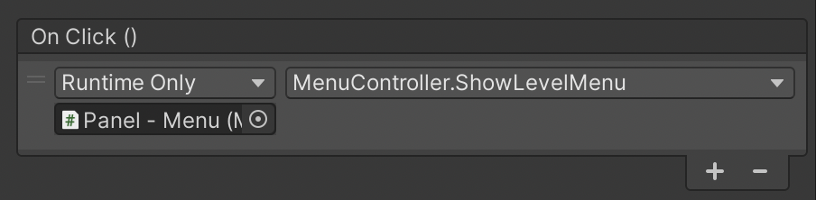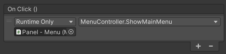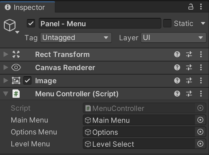 If you playtest the game now, you should be able to press Escape to show the Menu Panel, and it should show the Main Menu by default. None of the other two menus should be visible.