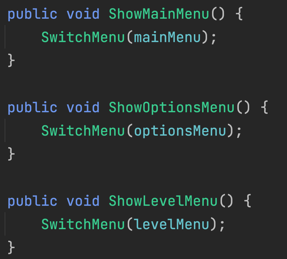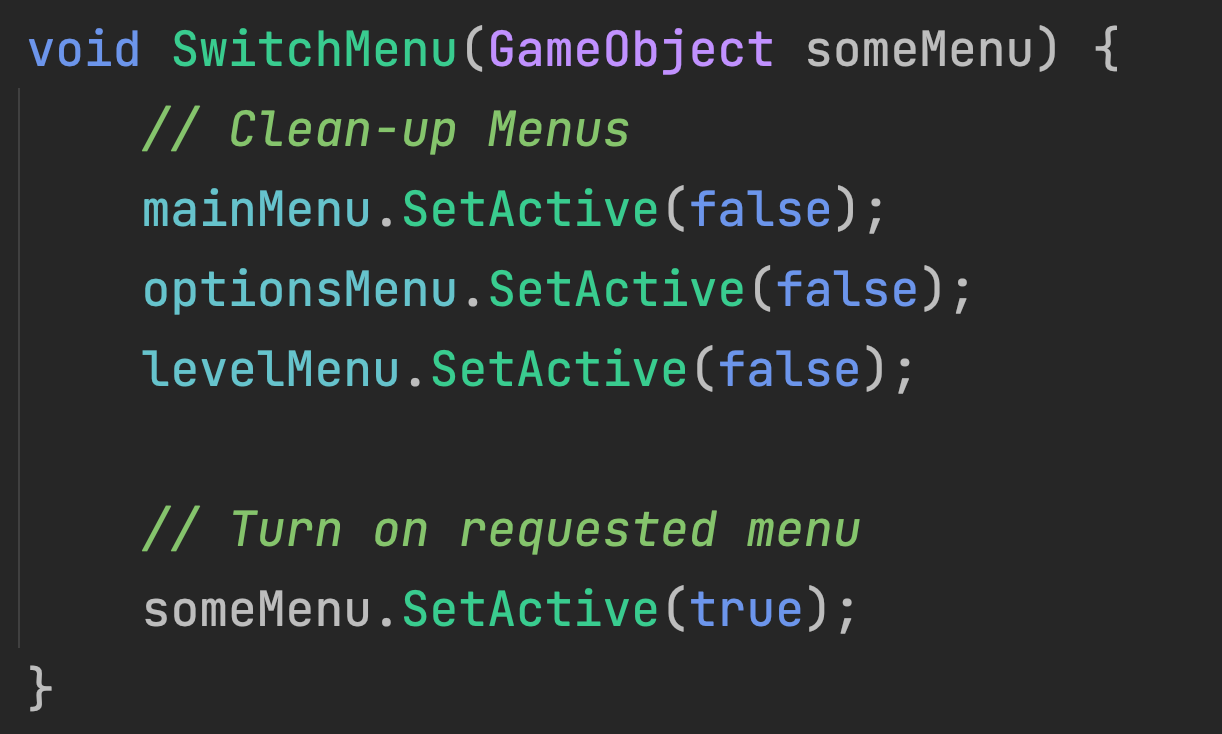 To further streamline setting up our Button component click events, we’re going to create even simpler utility functions for switching to specific menus.