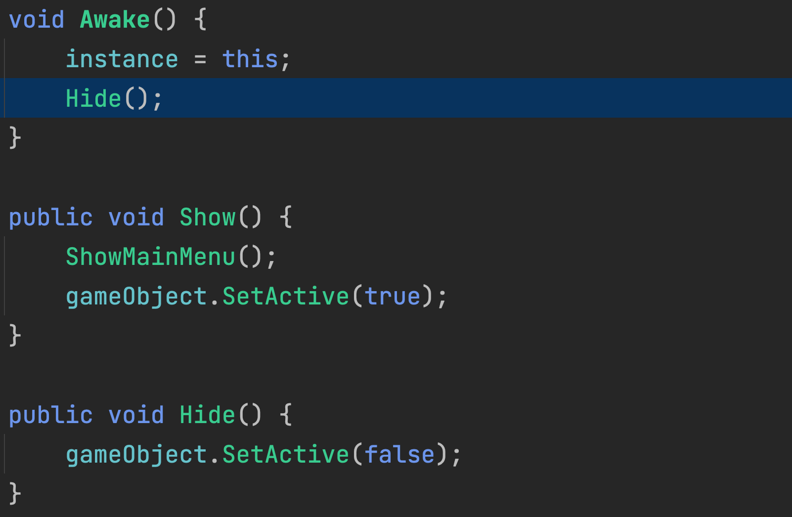 Since we don’t want our menu to stay visible right at the beginning of the game, the Hide function is called from the Awake after the menu has had time to set up.