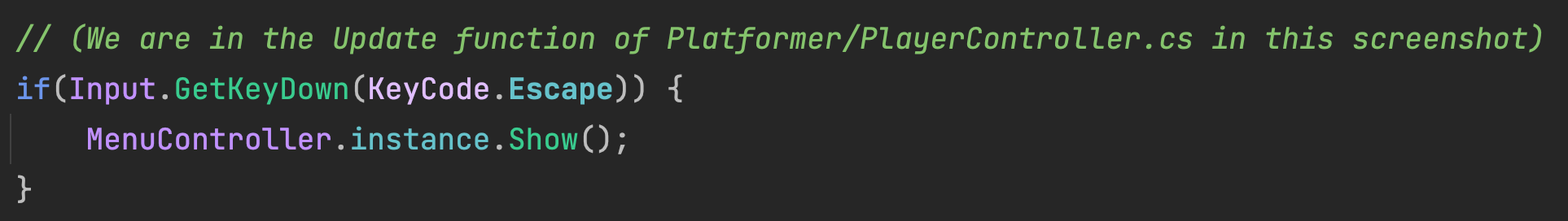 In PlayerController’s Update function, the Escape key will trigger showing the menu.