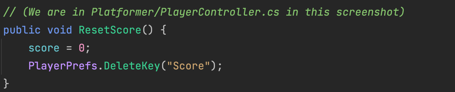 The Reset Score button requires a new function that we will put in the PlayerController.