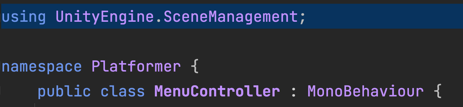 Create a MenuController script in the Platformer code folder and attach it to your "Panel - Menu" object.