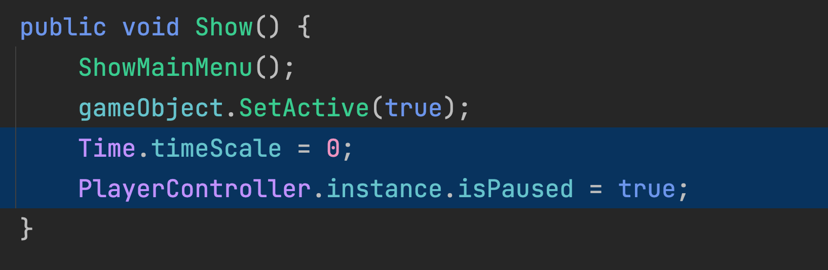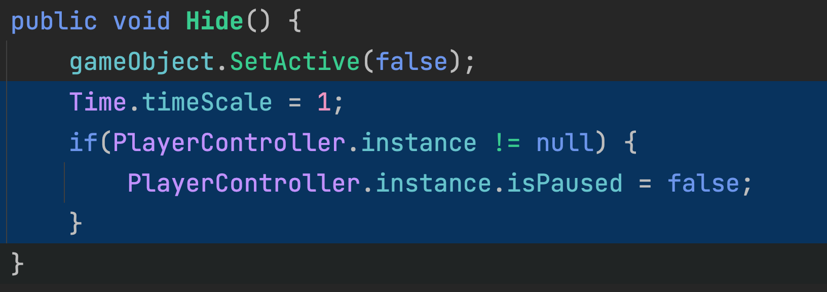 When we hide the menu, we unpause the game by doing the opposite. Remember that this code is also triggered by the Awake event when the Menu first automatically hides itself before gameplay. Because the PlayerController may not be set up yet (such as if its Awake function runs after MenuController's Awake event), we must check if the PlayerController instance is null.