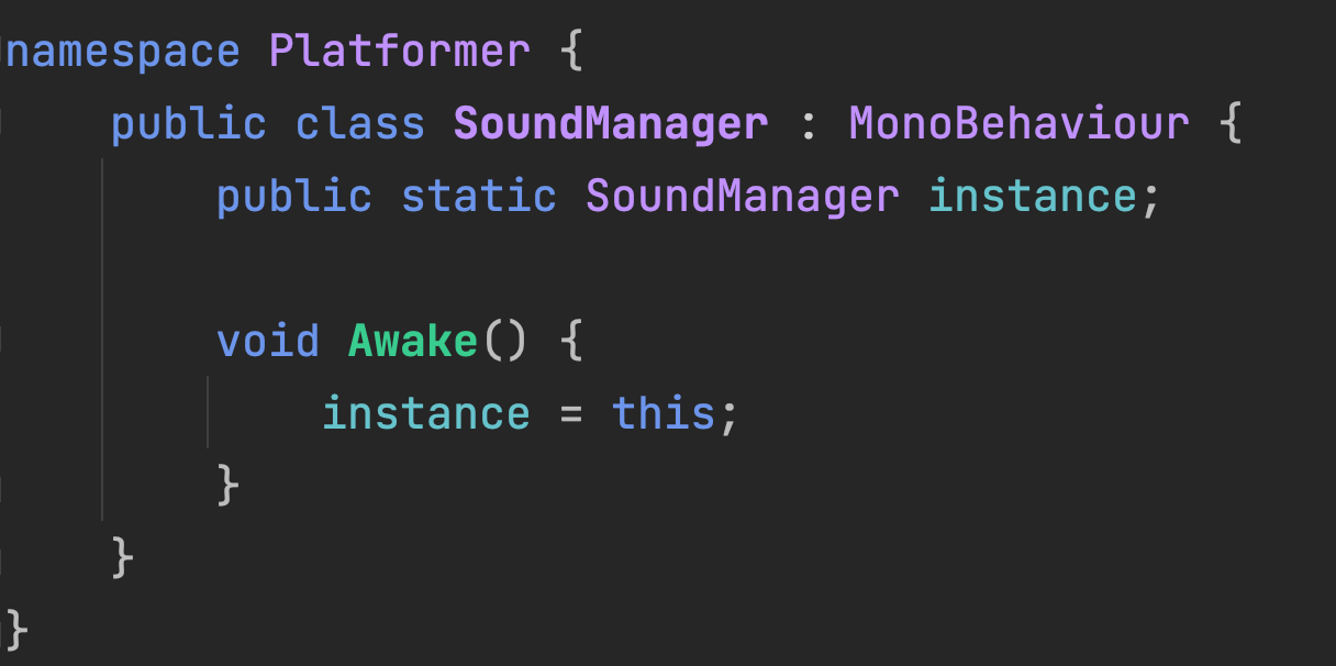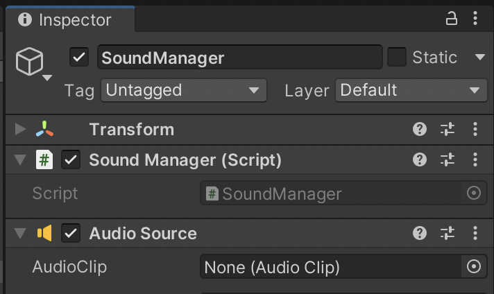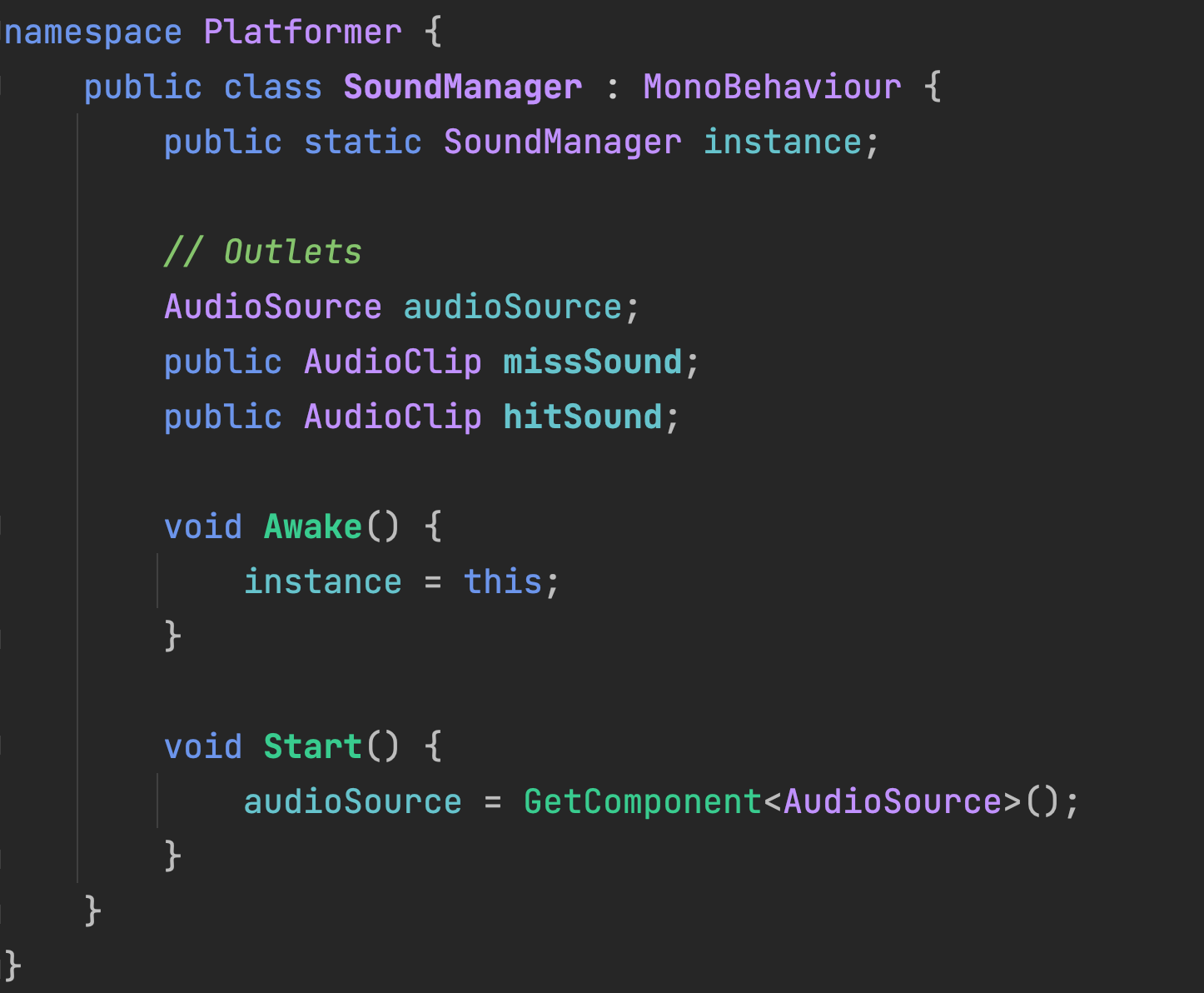 Create a new Empty Game Object in the scene named SoundManager. Attach an Audio Source component to it along with a new Sound Manager script. Continue to keep any code for this assignment organized in the same Platformer folder as before.