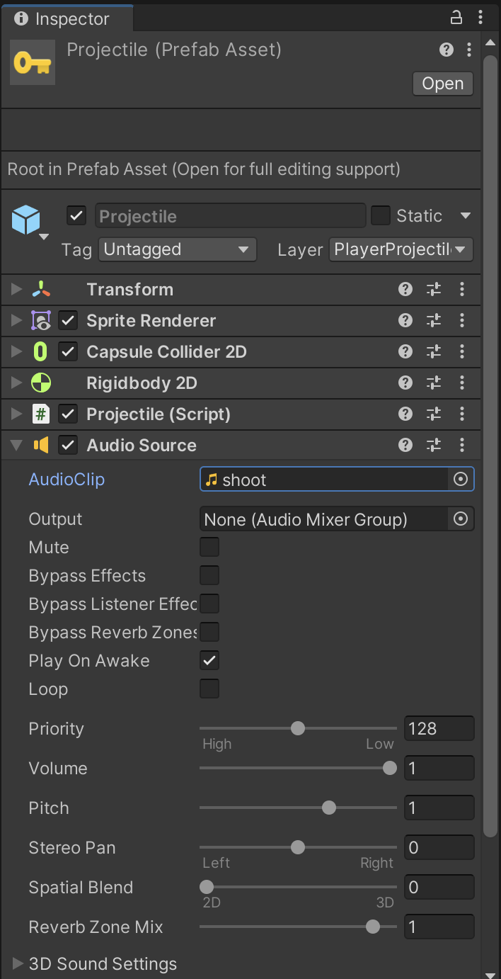 Select your Projectile Prefab and add an Audio Source component. Make sure "Play On Awake" is checked because we want the shoot sound to play right away and set your “Spatial Blend” to 2D to match our style of game.
