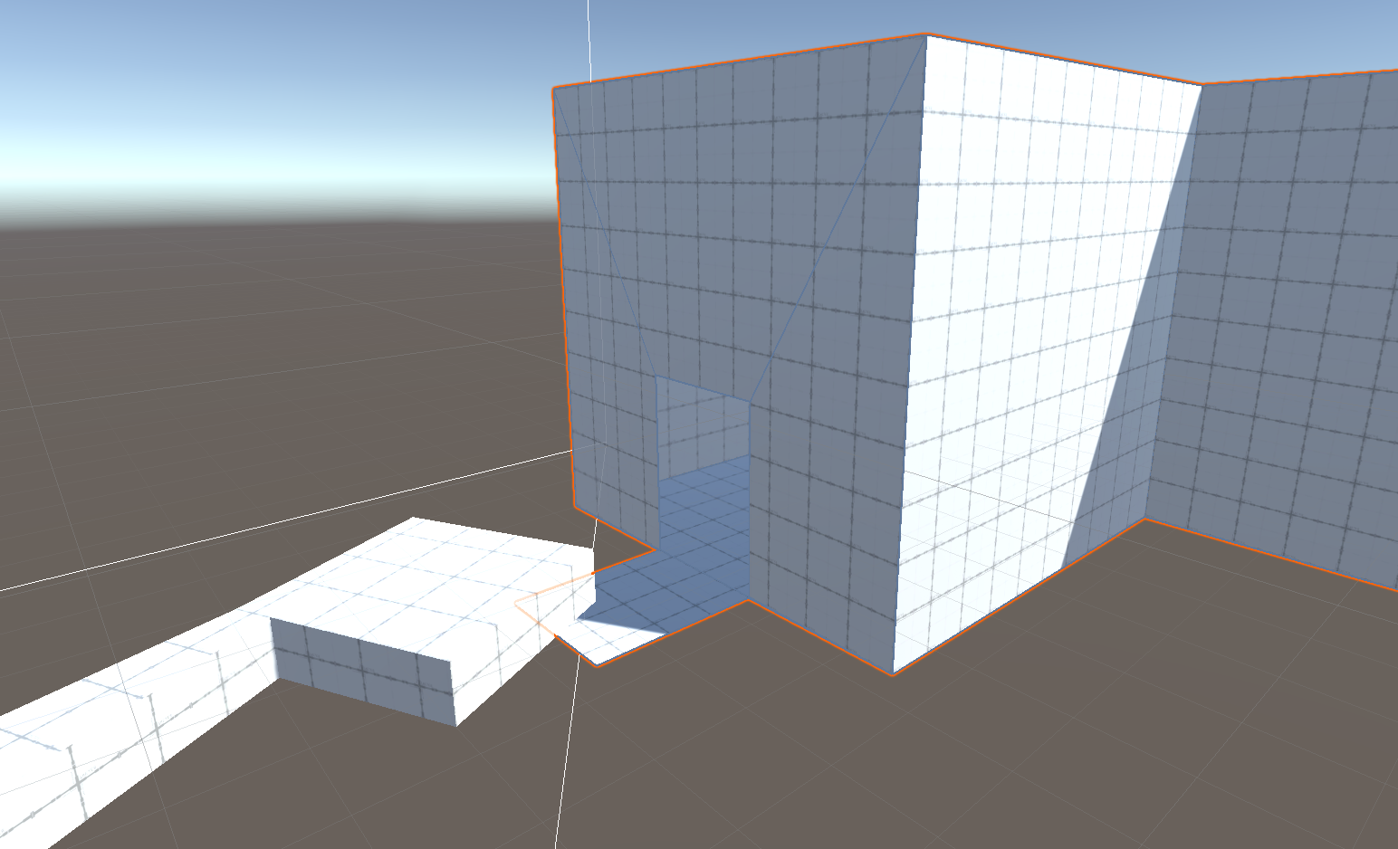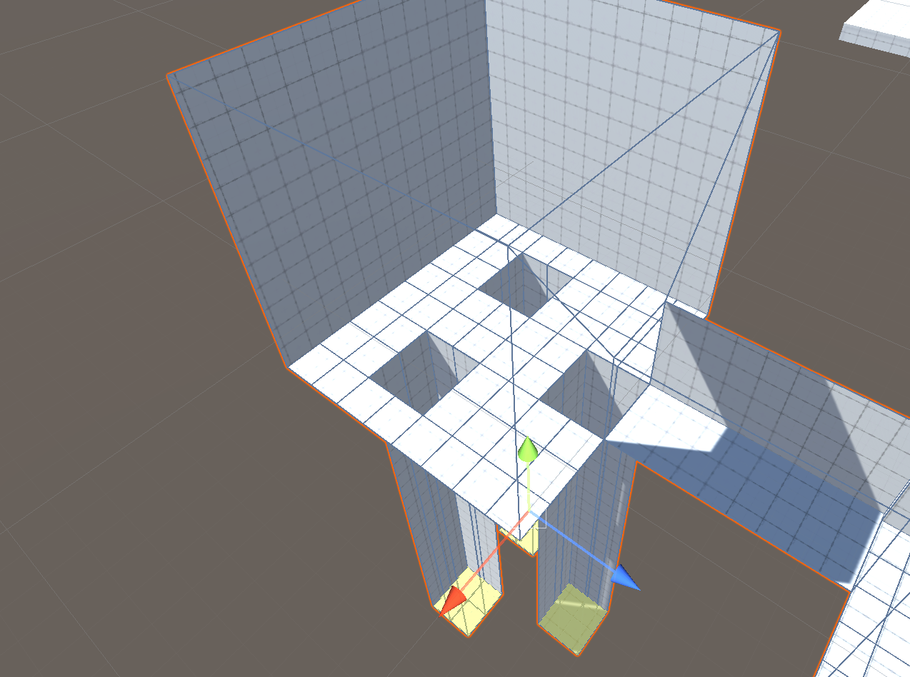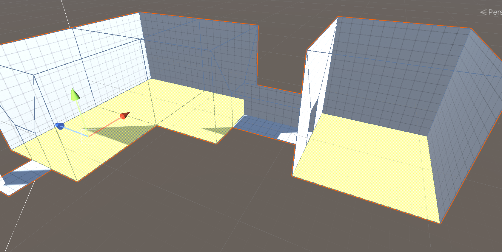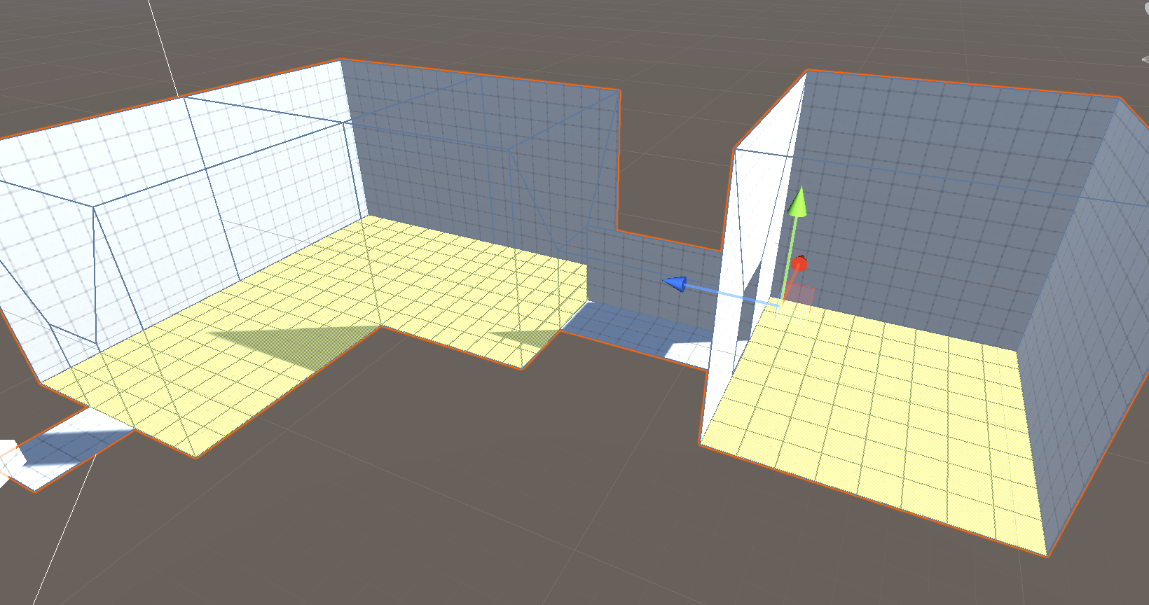 This portion of the level looks odd from the outside, so to create the look of a double-sided object, we actually have to duplicate the entire game object. Each game object will have their normals flipped in the opposite direction so that the rooms appear to have both inside and outside walls. If you make any changes to this shape, you will need to repeat making a clone with flipped normals to match.