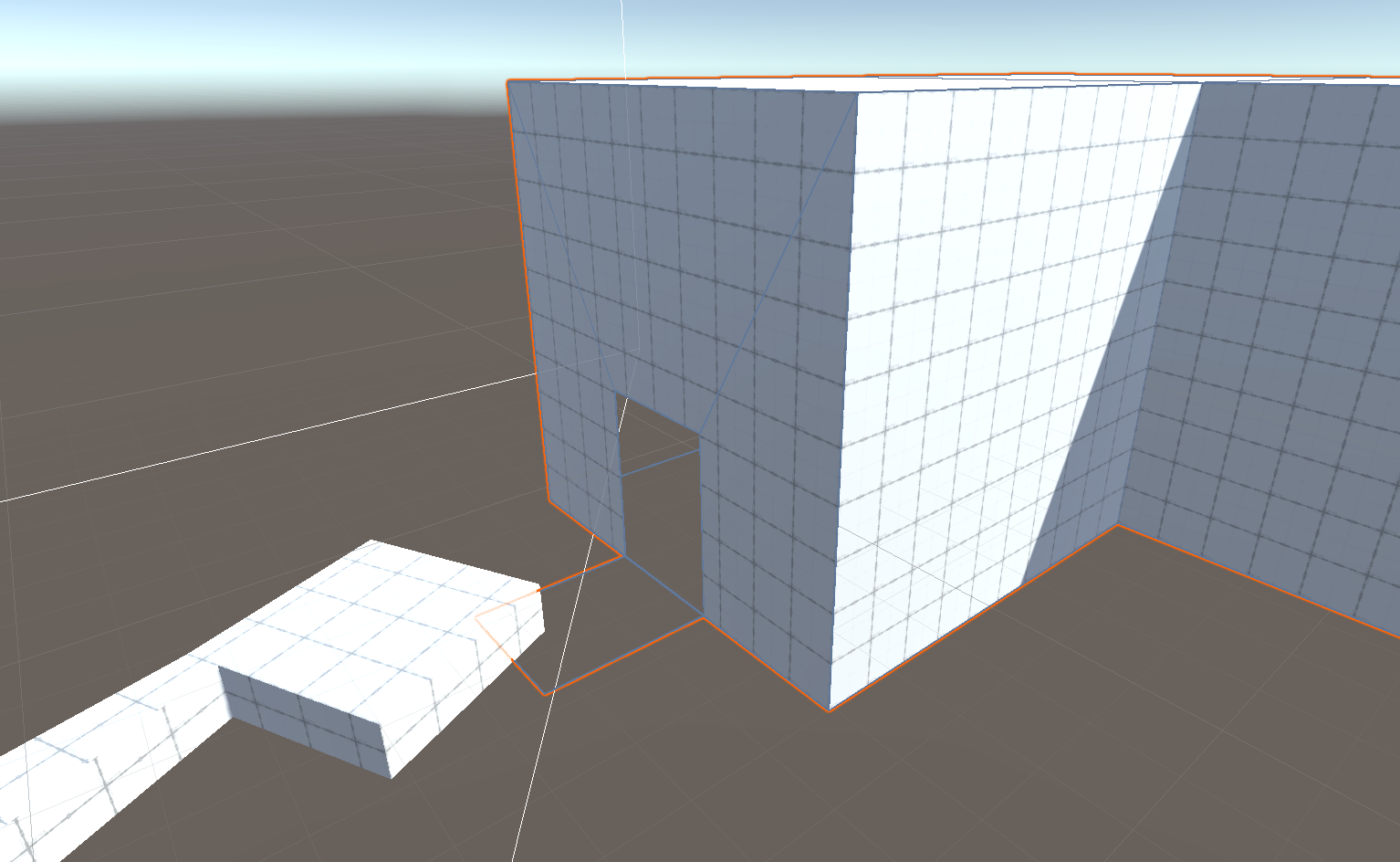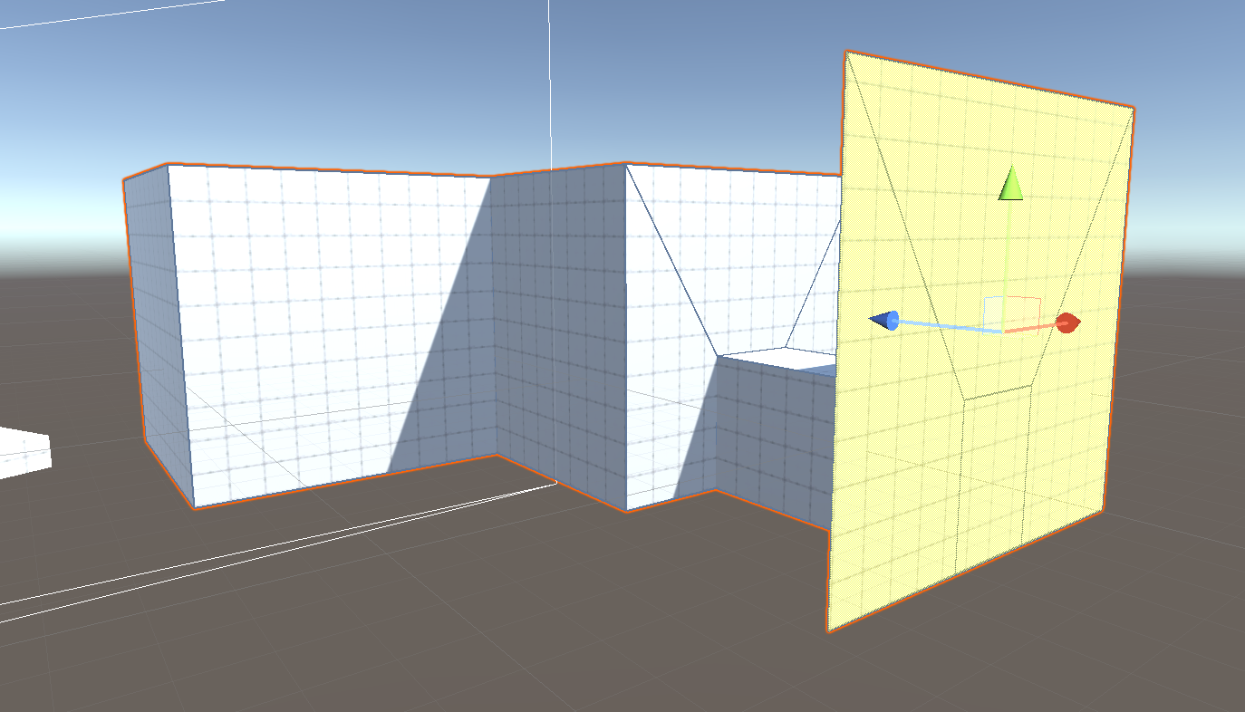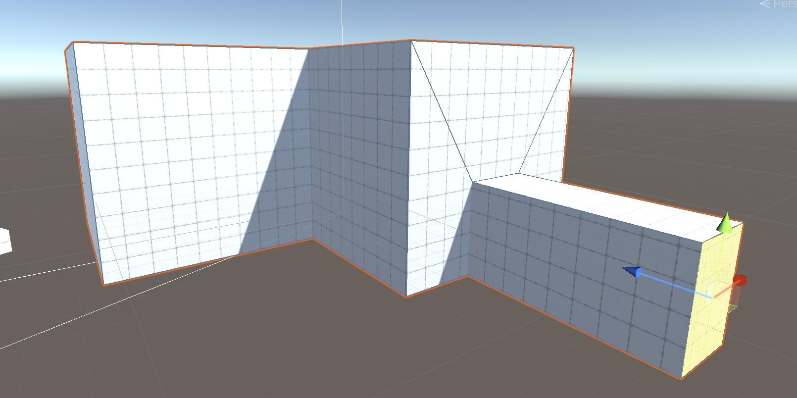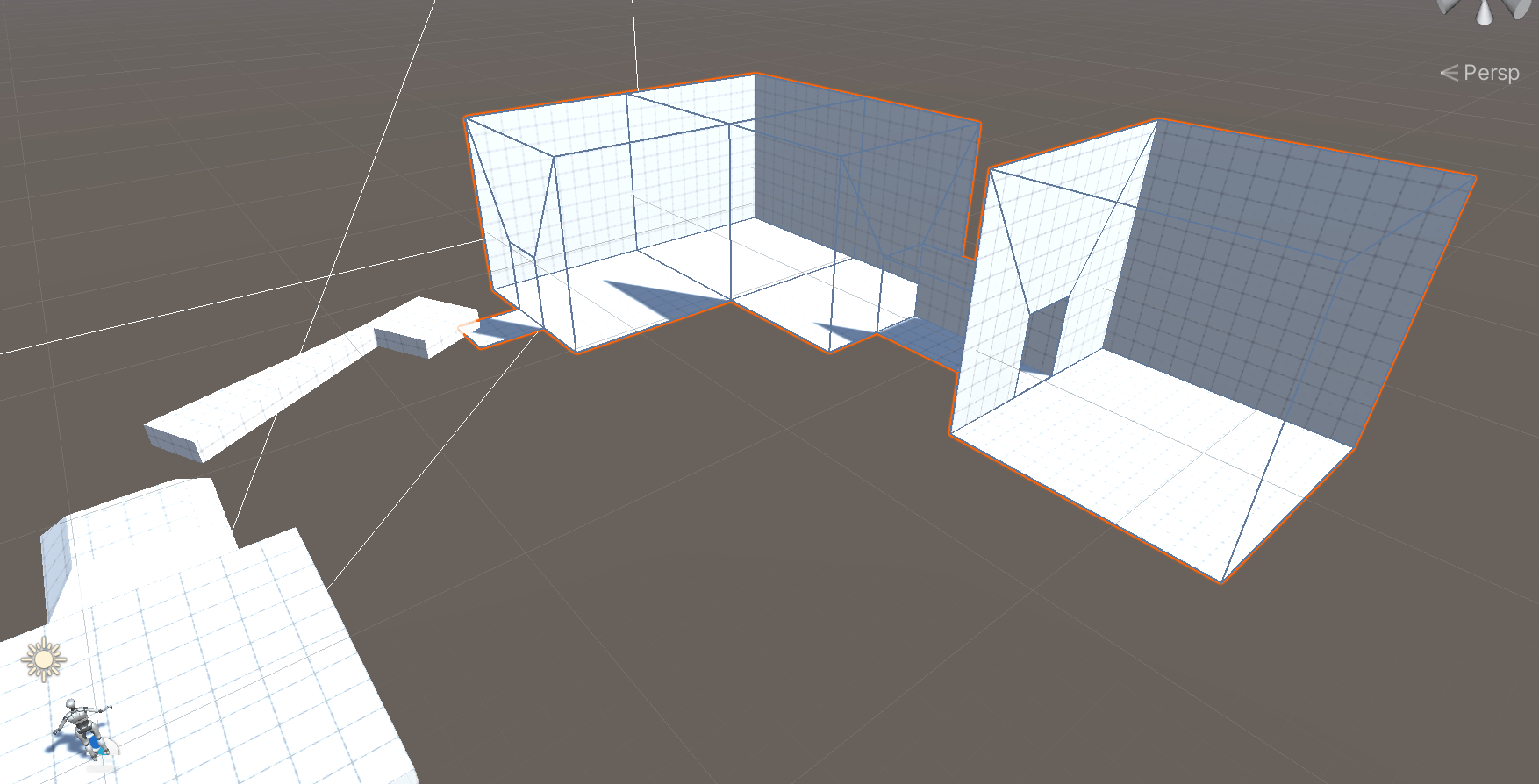 This portion of the level looks odd from the outside, so to create the look of a double-sided object, we actually have to duplicate the entire game object. Each game object will have their normals flipped in the opposite direction so that the rooms appear to have both inside and outside walls. If you make any changes to this shape, you will need to repeat making a clone with flipped normals to match.