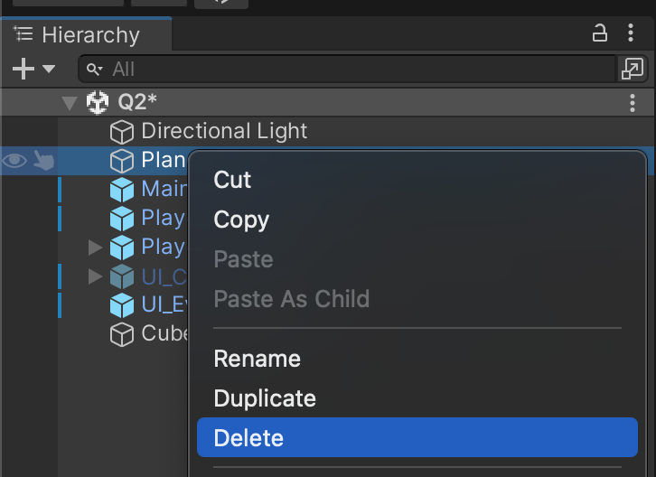 Delete the "plane" that the player is currently standing on. ProBuilder objects are different from the objects created in your prior assignment using the 3D menu. We will be replacing the old Plane with a ProBuilder Cube.