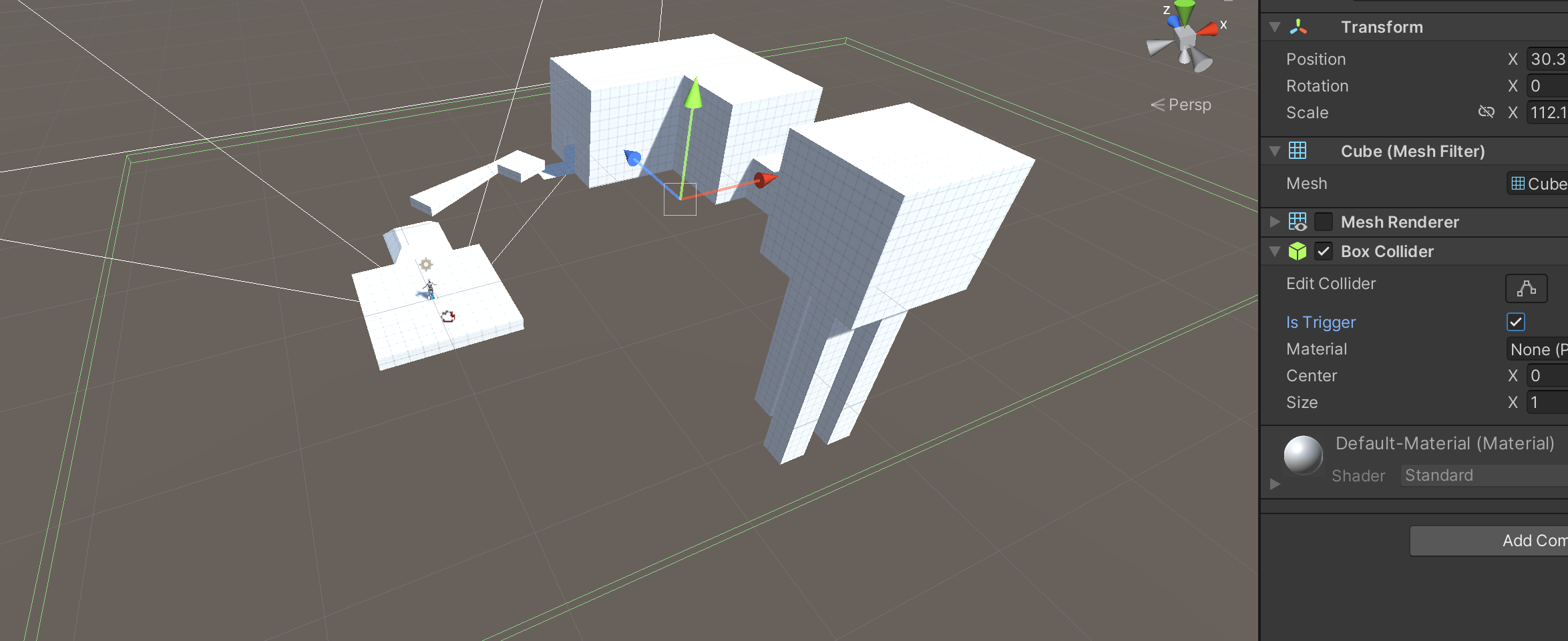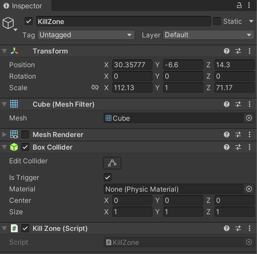 Once we're comfortable with the size, we turn off the mesh renderer so that the zone will be invisible and we set the collider to trigger, so that the player will pass through it.
