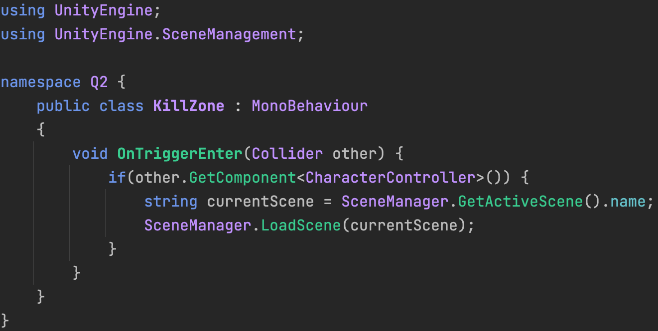We will create a KillZone script whose OnTriggerEnter event will check for a CharacterController component on the incoming object, and reload the scene as appropriate. If you don't remember how to do Trigger events and SceneManagement functions, it's recommended you review the assignments from last semester.
