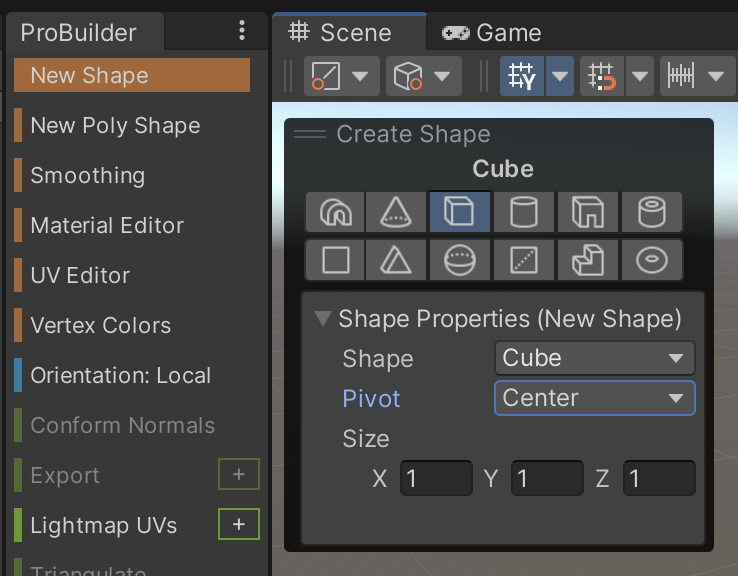 Back in the ProBuilder Window, we can use the New Shape tool to create common 3D shapes known as primitives. Take a moment to review the various primitives available. Most complex 3D objects can be made by modifying these primitives.