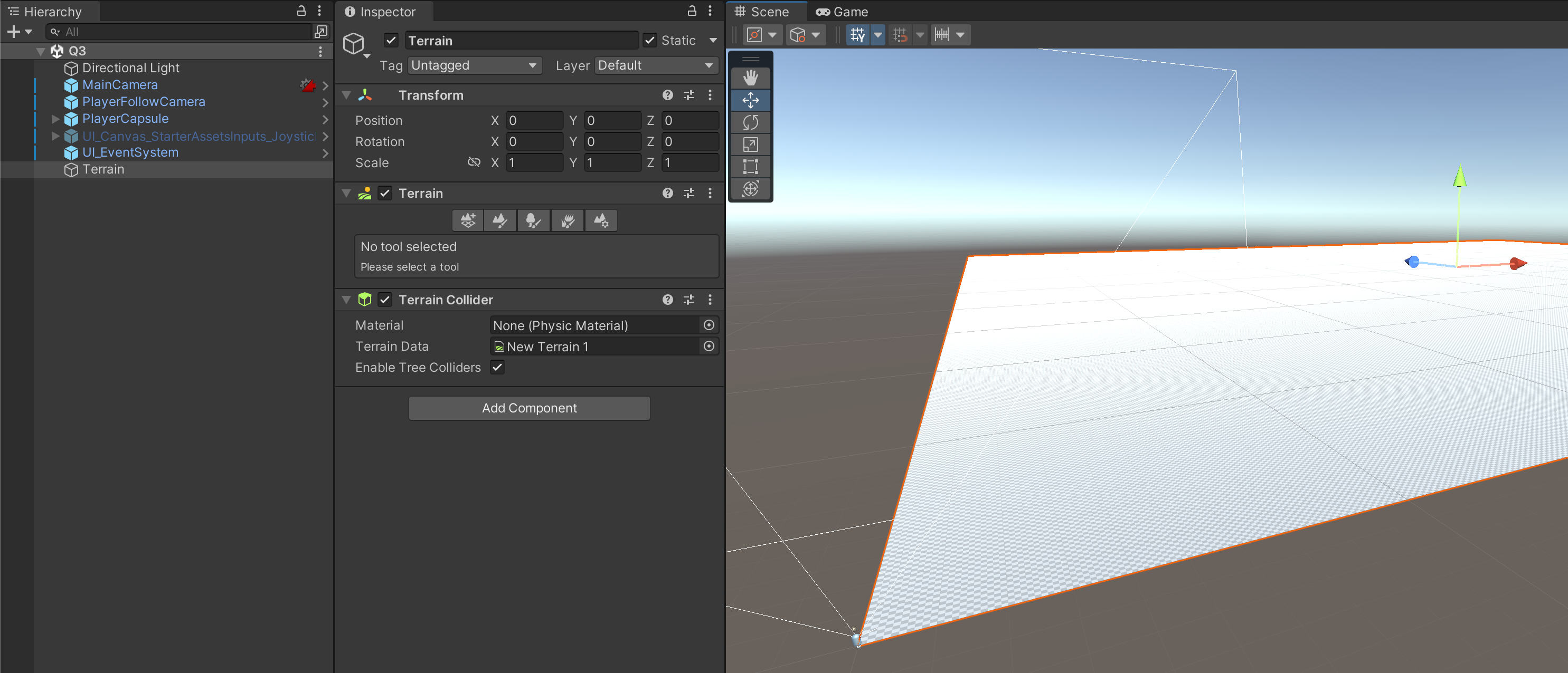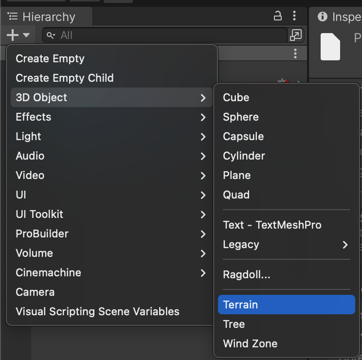 Now that our project's packages are set up, we can begin creating our terrain environment. Create a Terrain game object from the Hiearchy tab using + > 3D Object > Terrain.