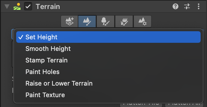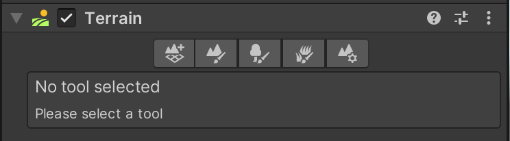Examining the Terrain component on the Terrain game object, you will see five tabs that represent five categories of terrain tools.