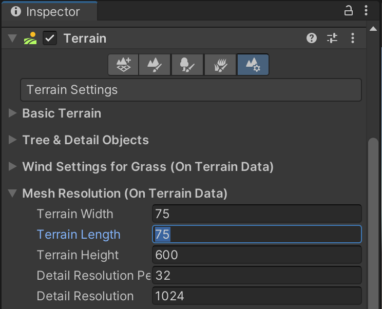 Using the fifth tab which is Terrain Settings, find the "Mesh Resolution" settings category. The default size for the Terrain Width and Length is 1000. Because Unity units are in metric, this means the default terrain is 1 kilometer squared.